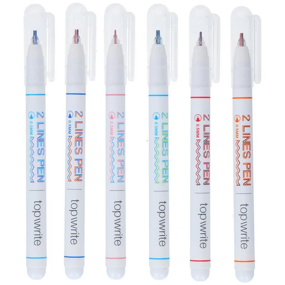 Zestaw 6 długopisów kulkowych z podwójną linią o różnych kolorach. Długopisy posiadają końcówkę z włókna dla gładszego użytkowania.Zastosowanie w biurze, szkole lub domu.