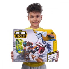 - METAL MACHINES SHARK PLAYSET: staw czoło groźnemu rekinowi! Wszyscy mali fani motoryzacji oraz trików kaskaderskich na pewno krzykną z radości na widok tego niesamowitego toru samochodowego!