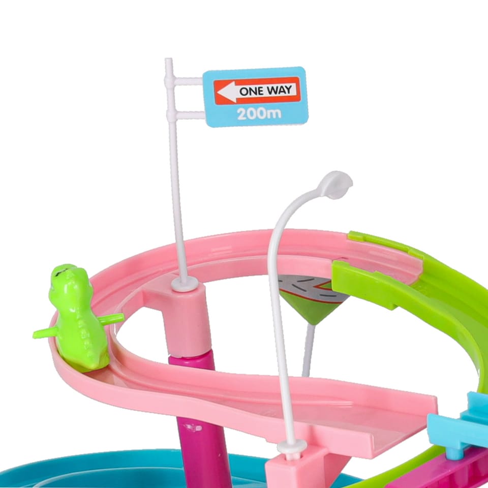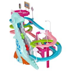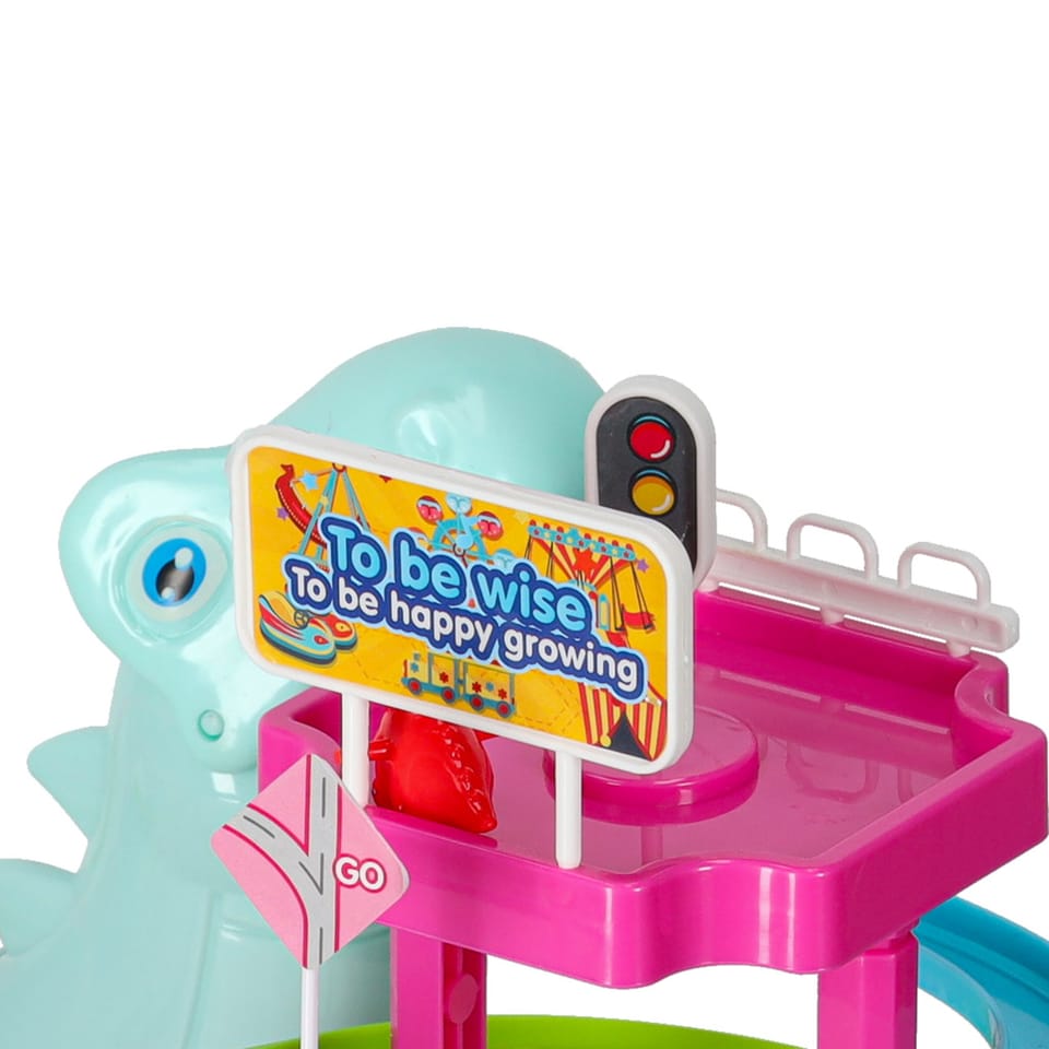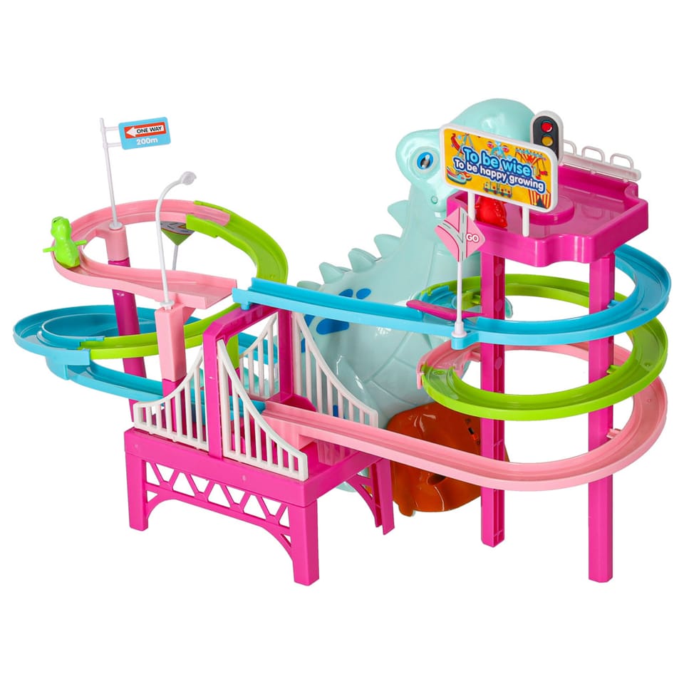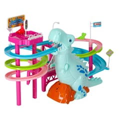 Tor wyścigowy z dinozaurem, który połyka samochodziki w kształcie małych dinozaurów to świetna zabawa dla dzieci.