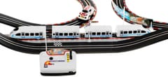 | - sportowe autko, - pociąg, - dwa piloty (jeden do kolejki oraz jeden do autka), - znaki drogowe, - latarnie/lampy drogowe, - podstawki pod znaki i lampy, - barierki ochronne, - słupy, - 7 naklejek, - 28 części toru. |