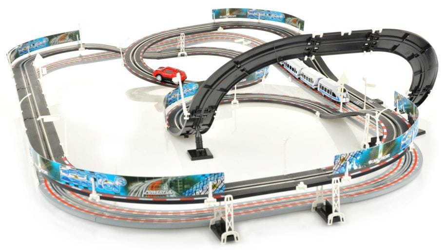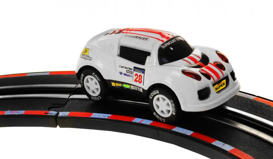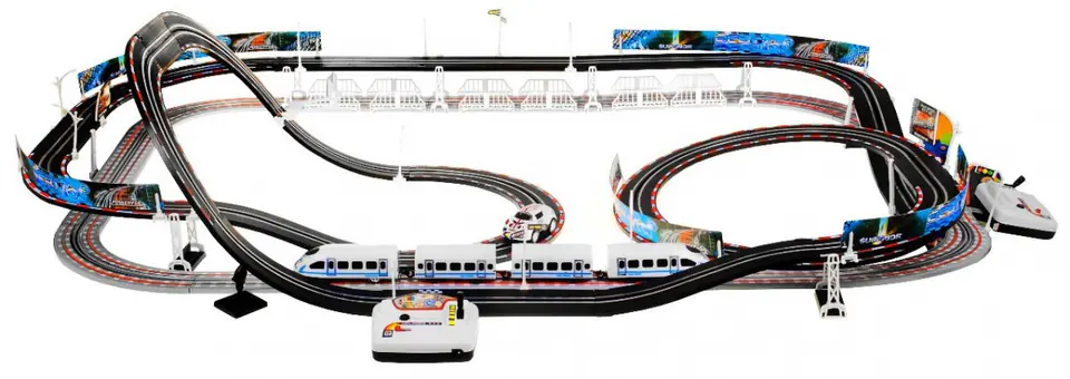 | Podwójny tor wyścigowy którego konstrukcyjne elementy pozwolą zbudować tor z ostrymi zakrętami, serpentynami i odcinkami prostymi, a wszystko po to, aby maksymalnie uatrakcyjnić zabawę. Zestaw posiada 2 bezkolizyjne skrzyżowania i 2 pętle. Dzięki temu autko i kolejka mogą bezwypadkowo poruszać się po swoich torach. Piloty posiadają ergonomiczny kształt idealnie dopasowany do dłoni dziecka tak, aby nie wyślizgiwały im się z rąk podczas zabawy. Zasilanie zestawu to 4 baterie typu AA (brak w zestawie). | |