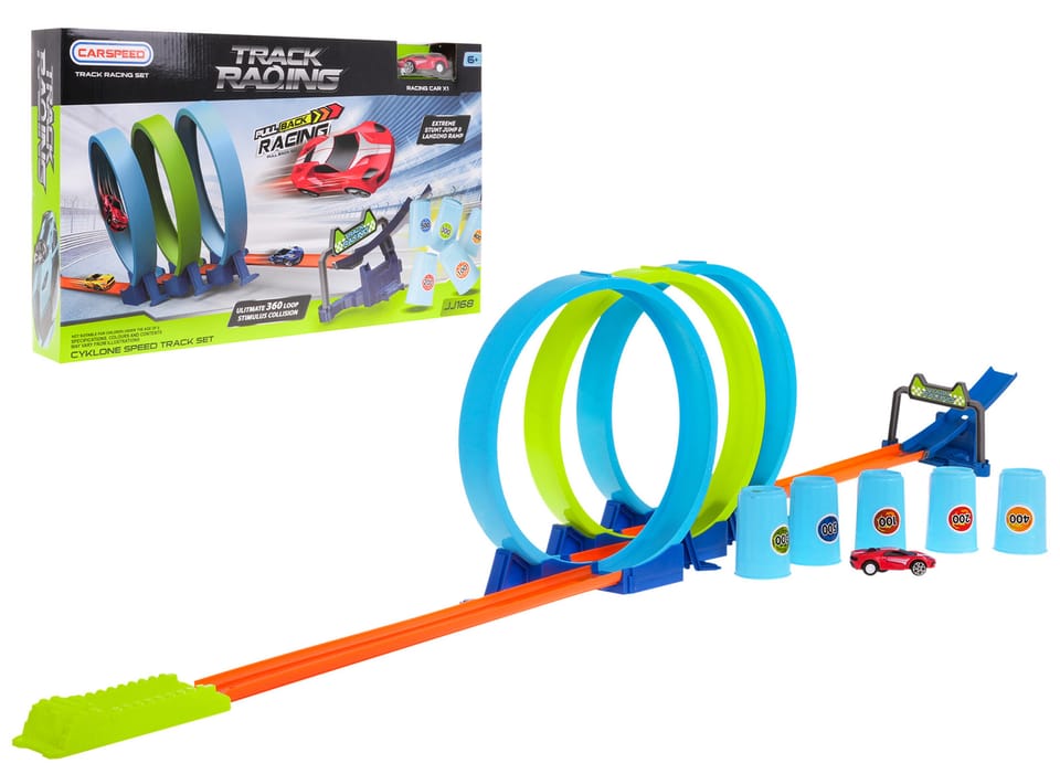 | Tor wyścigowy z trzema pętlami oraz samochodzikiem w zestawie to propozycja dla dzieci od szóstego roku życia. Autko dołączone do zestawu posiada napęd pull back, należy je umieścić na torze, a następnie pchnąć do tyłu. Samochodzik pojedzie do przodu, pokona ostre trzy pętle, a następnie pomknie torem do przodu i wjedzie na rampę, by z niej poszybować w górę i strącić przeszkody w postaci beczek (beczki w zestawie). Zabawka nie wymaga użycia baterii. | |