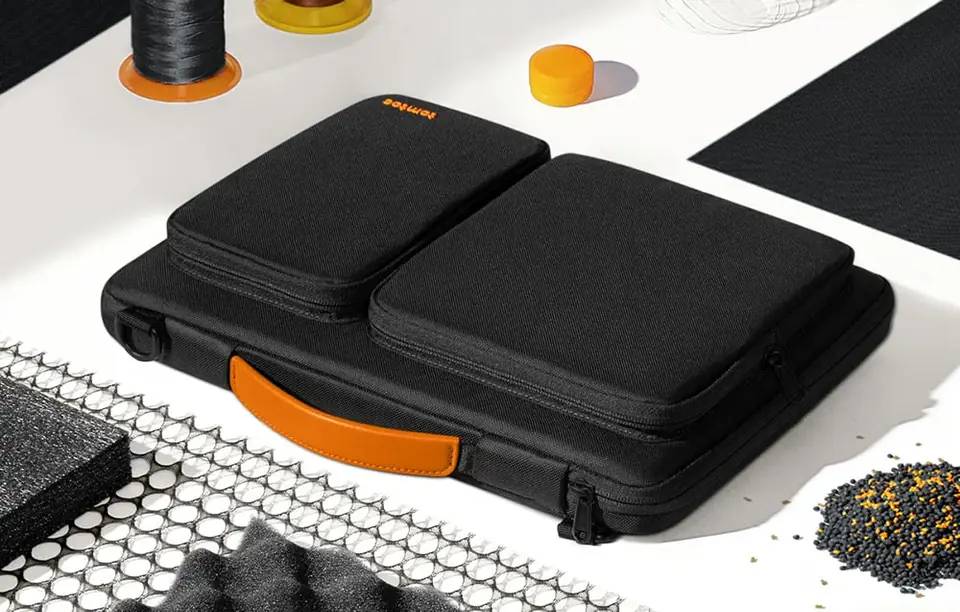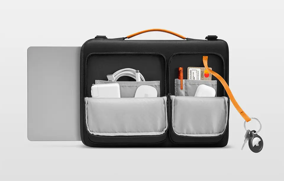 Tomtoc Defender A42 to teczka/torba na laptopy o przekątnej 16 cala - posiada jedną dużą komorę dwie bardzo pojemne kieszenie przednie oraz pojemną kieszeń tylną. Pasuje perfekcyjnie na MacBooka Pro M1/M2 Pro/Max 2023-2019. Otwierana jest tylko wzdłuż jednego krótszego boku, aby zapewnić większą ochronę. Wszystkie krawędzie, ze szczególną dbałością o rogi, wyłożone zostały materiałem absorbującym wstrząsy. Teczka spełnia wojskowy standard MIL STD 810H-516.8 w zakresie upadków. Wnętrze pokrowca wyściełane zostało delikatnym materiałem oraz grubą warstwą wypełnienia.