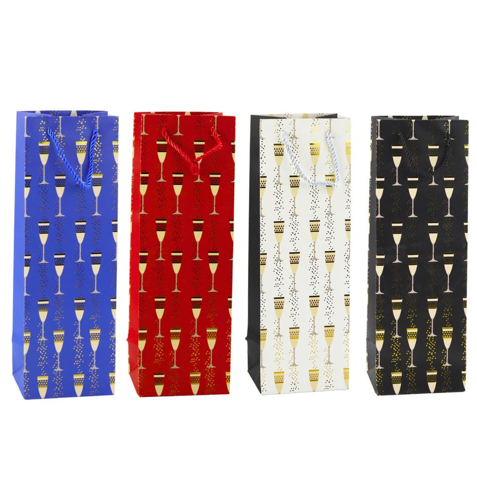 Torebka wyróżnia się efektownym nadrukiem w motyw kieliszków z elementami złotego połysku, który doskonale wpisuje się w klimat uroczystości ? wesel, urodzin, rocznic, Sylwestra czy spotkań firmowych. Dostępna w czterech kolorach: niebieskim, czerwonym, białym i czarnym.