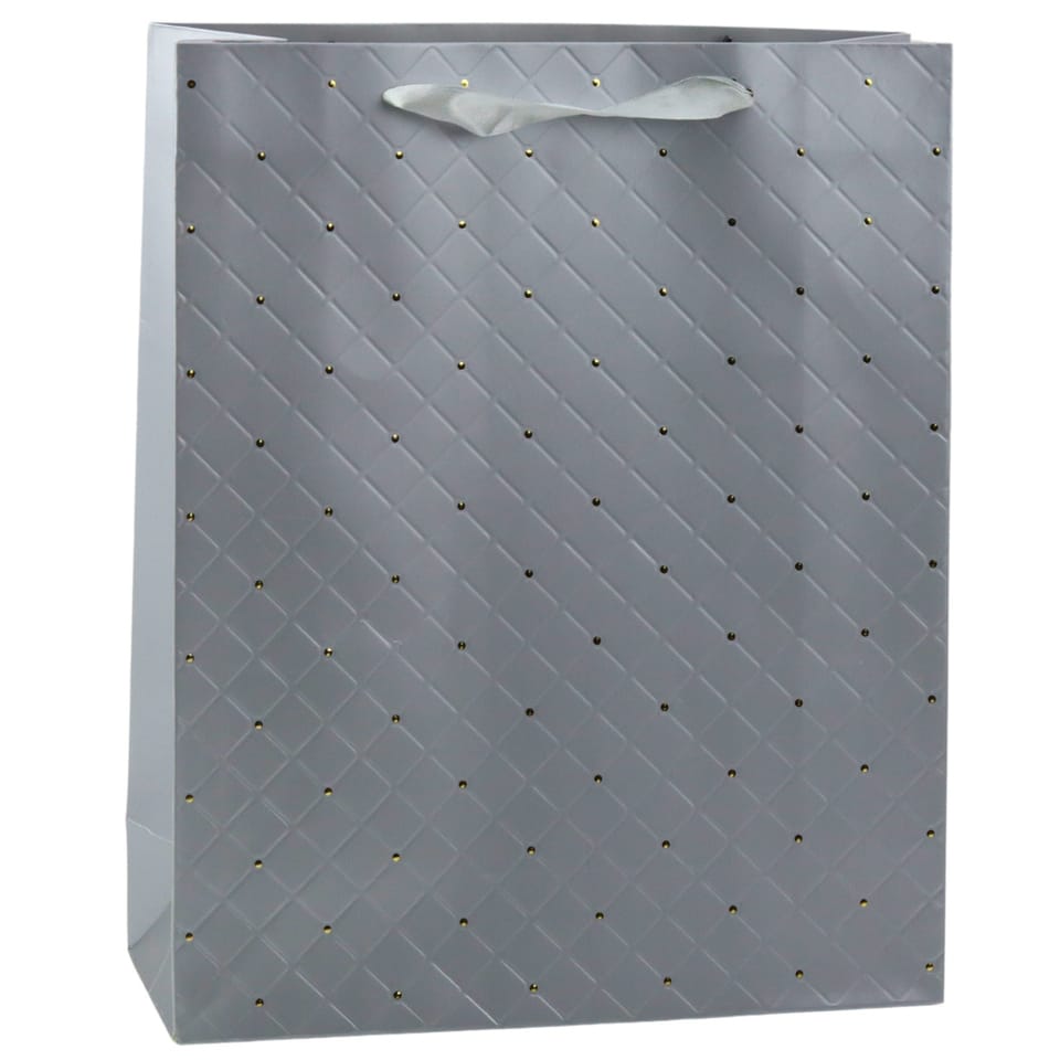 Stylowa torba prezentowa w eleganckim, szarym kolorze to doskonały wybór dla osób ceniących nowoczesny szyk i klasyczną estetykę. Jej stonowany odcień w połączeniu z geometrycznym tłoczeniem w formie rombów i delikatnymi złotymi kropeczkami nadaje całości wyjątkowo wyrafinowanego wyglądu. To znakomite opakowanie prezentowe na uroczystości takie jak wesela, rocznice, jubileusze, święta czy eleganckie przyjęcia.