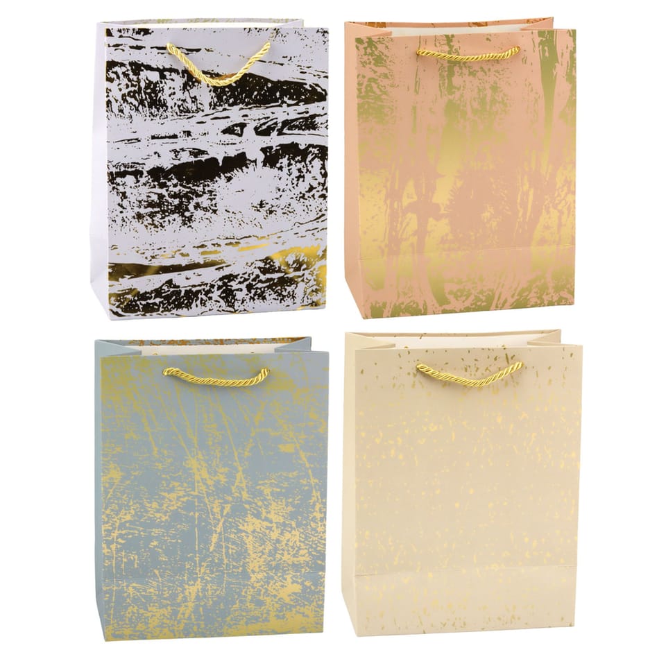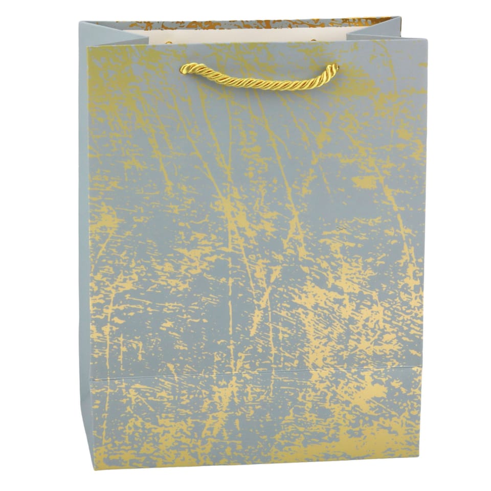 Elegancka torba prezentowa w odcieniach szarości, zdobiona złotym, nieregularnym wzorem to stylowe i ponadczasowe opakowanie na upominek, które samo w sobie przyciąga wzrok i podkreśla wyjątkowy charakter prezentu. Subtelne złote akcenty pięknie połyskują w świetle, dodając całości luksusowego, nowoczesnego wyglądu, który z pewnością zrobi wrażenie na obdarowanej osobie.