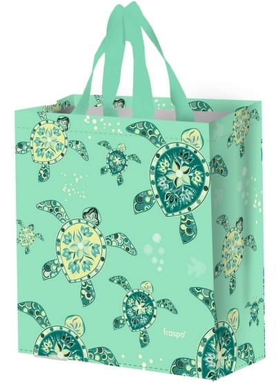 Torba Żółwie jest ekologiczna - wykonana z polipropylenu laminowanego.Torba jest wielokrotnego użytku - niezbędna na każde zakupy, a przy okazji podkreśli Twój styl!Pojemność 14 litrów, wymiary torby: 30 x 14 x 33 cm.Torby Fraspo są dostępne w wielu atrakcyjnych wzorach.Opakowanie zbiorcze zawiera 100 sztuk.