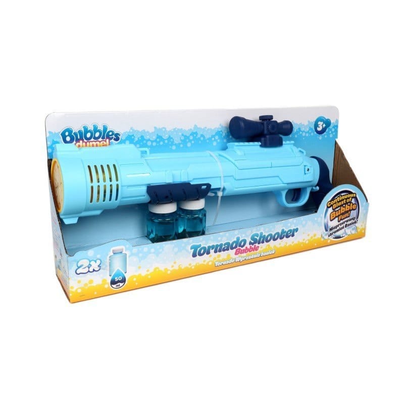 Tornado - wyrzutnia baniek Daj się wciągnąć w wir bąbelkowej zabawy! Z wyrzutnią Tornado, wyposażoną w płyn, wyczarujesz nieprzerwany strumień baniek. Aby przystąpić do zabawy, należy zasilić zabawkę bateriami, wkręcić pod lufę buteleczkę, zgodnie z obrazkową instrukcją z opakowania i pociągnąć za spust, aby z lufy wyrzutni wystrzeliły bańki! Do zestawu dołączone są aż dwie buteleczki płynu o pojemności 50 ml, a jeśli i ten zapas się wyczerpie, w ofercie Dumel Bubbles znajdziesz płyny o różnej pojemności, którymi można uzupełnić buteleczki. Z produktu należy korzystać na świeżym powietrzu. Produkt przeznaczony jest dla dzieci od 3 roku życia. Cechy produktu: - w zestawie: wyrzutnia baniek i 2 płyny do baniek o pojemności 50ml; - produkt przeznaczony do zabawy na świeżym powietrzu; - wyrzutnia zasilania bateriami: 4xAA (niezawarte w zestawie); - wiek: 3+