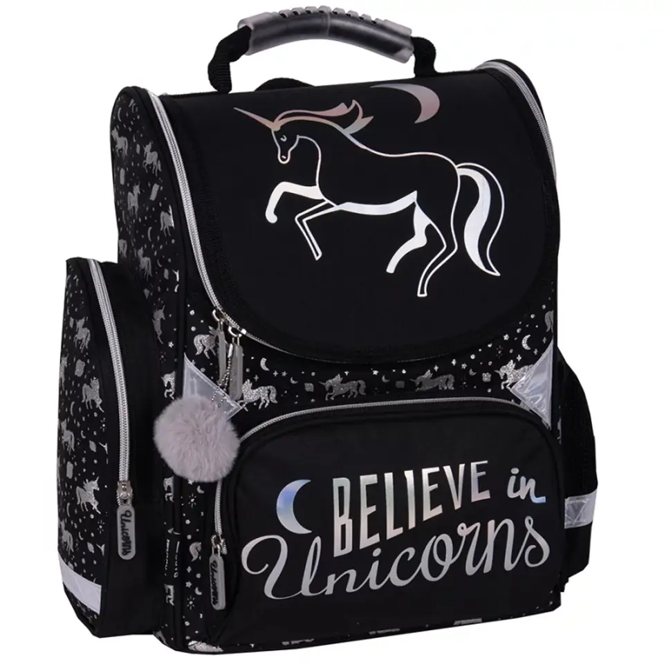 Śliczny tornister szkolny Jednorożec posiada jedną obszerną komorę, zapinaną na zamek dwukierunkowy z ozdobnymi pullerami ułatwiającymi zamykanie.
