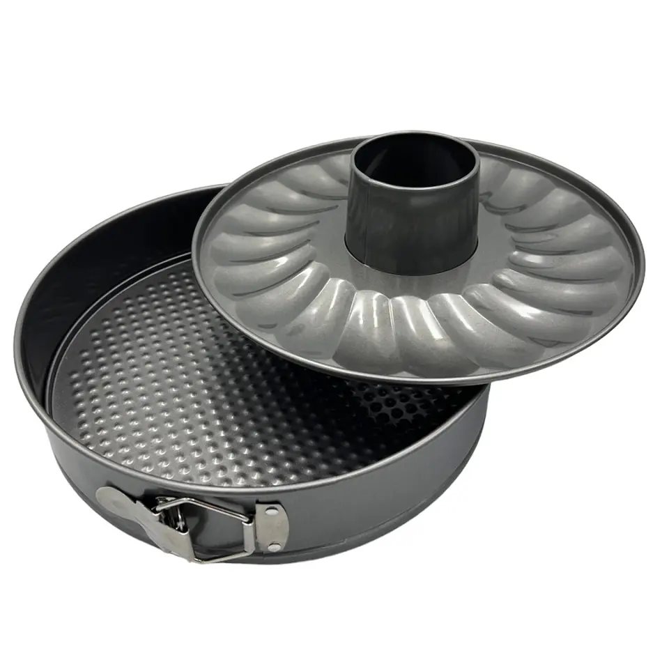 Tortownica z wymiennym dnem. Pozwala upiec ciasto na tradycyjny tort a po wymianie na dno z kominem ciasta z dziurką (babki). Odpinany rant ułatwi wymianę dna oraz wyjęcie ciasta z formy.