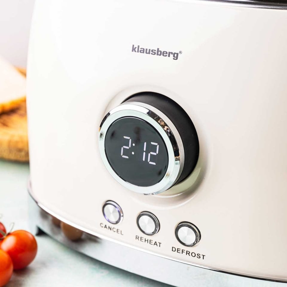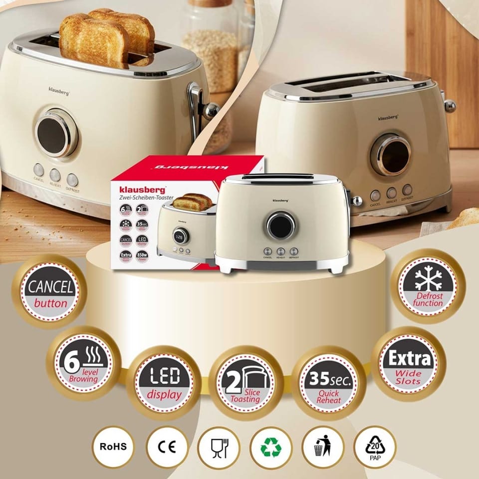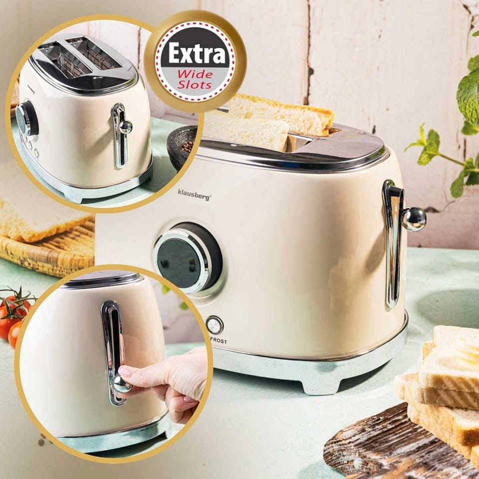 Model KLAUSBERG KB-9026 to wyjątkowy toster inspirowany stylem retro, który łączy estetykę z praktycznymi rozwiązaniami. Kremowa obudowa w połączeniu z chromowanymi detalami sprawia, że urządzenie doskonale prezentuje się zarówno w klasycznych, jak i nowoczesnych wnętrzach. Dzięki zaawansowanym funkcjom przygotujesz tosty dokładnie takie, jakie lubisz – szybko i wygodnie.