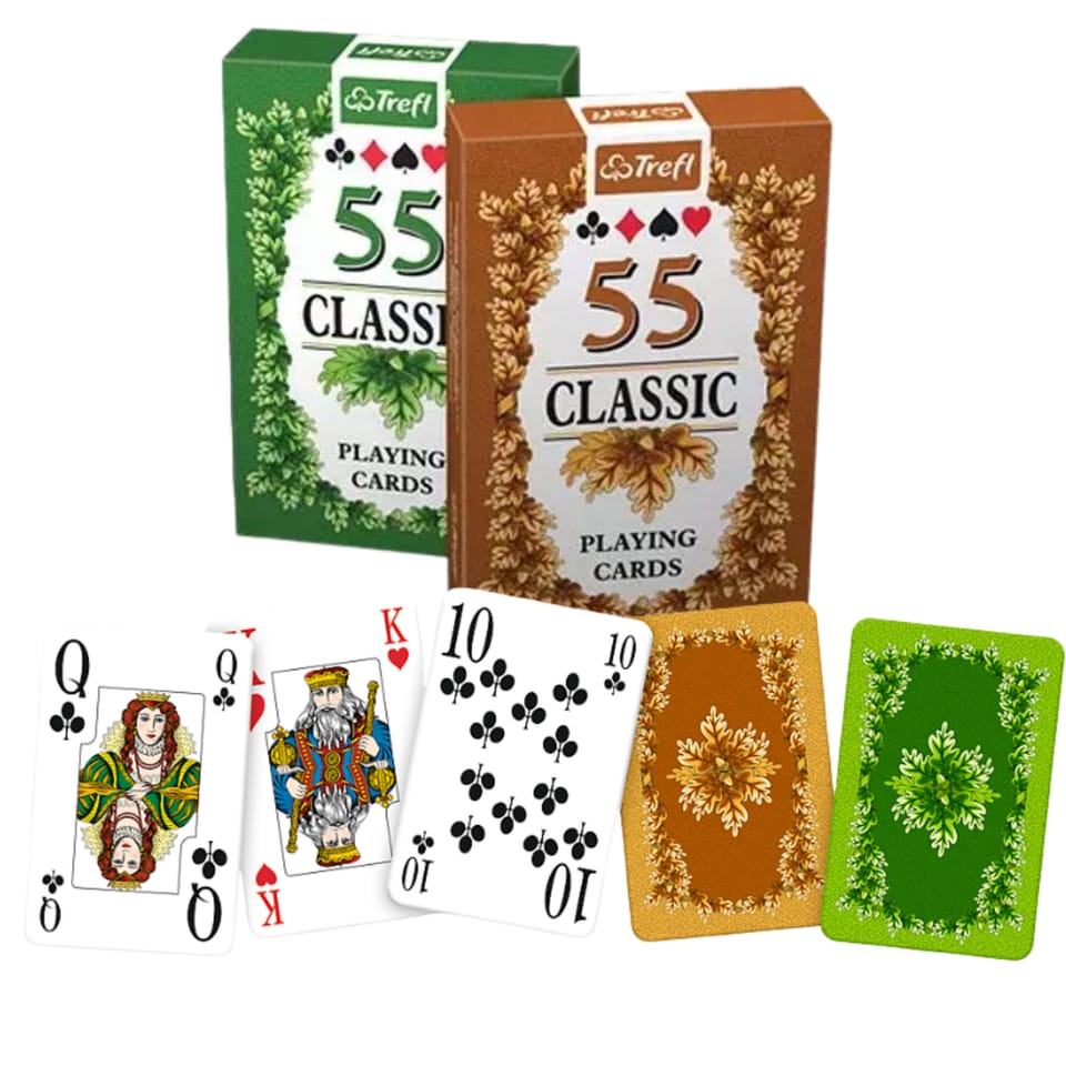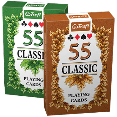 Classic - karty standardowe Karty Classic to wzór znany w Polsce od dziesięcioleci. Charakterystyczne bursztynowe rewersy ozdobione są liśćmi dębu, a figury i kolory oznaczone międzynarodowym wzorem. Talia dla graczy lubiących klasykę w tradycyjnym wydaniu. Talia zawiera 55 listków karcianych od 2jek do asów. Producentem kart są działające od 1947 roku Krakowskie Zakłady Wyrobów Papierniczych Trefl-Kraków