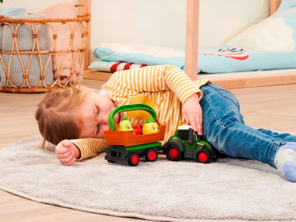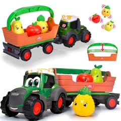 Zestaw Freddy Fruit Trailer to kolorowa i interaktywna zabawka, która przenosi maluchy w świat farmy i zbierania owoców. W skład zestawu wchodzą: zielony traktor marki Fendt z przyjazną buźką i dużymi oczami, brązowa przyczepka oraz trzy owce z twarzami - jabłko, gruszka i ananas.