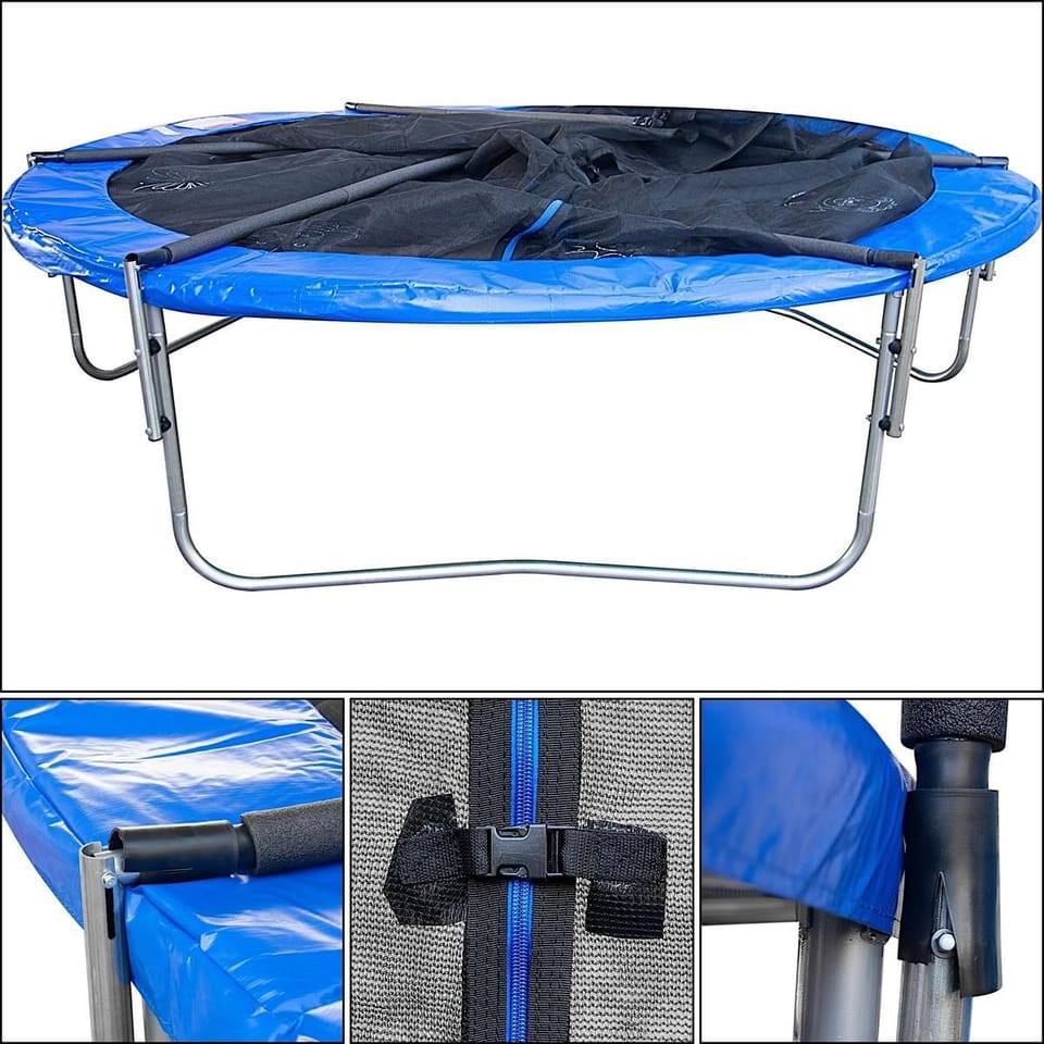 - średnica 244 cm zapewnia komfortową przestrzeń do swobodnego skakaniasiatka wewnętrzna oddziela użytkownika od sprężyn i zwiększa bezpieczeństwostabilne nogi w kształcie litery U poprawiają wytrzymałość i równowagęskładana konstrukcja ułatwia montaż i przechowywanie poza sezonem oraz ochronę przed wiatremzamek błyskawiczny z klamrą zabezpieczającą zwiększa kontrolę wejściastalowa rama zapewnia trwałość i odporność na obciążenia dynamiczne