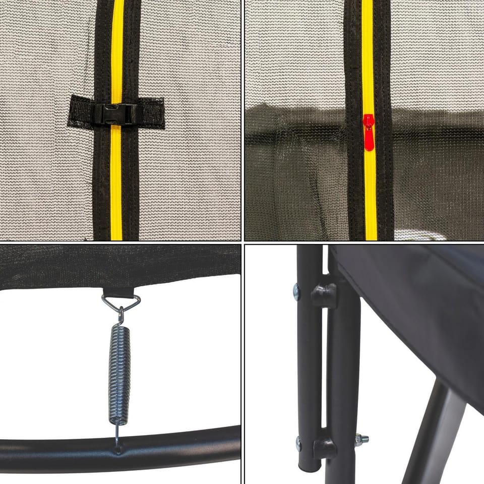 Wyposażona w specjalne grube osłony na sprężyny zabezpieczy je przed czynnikami zewnętrznymi i ochroni stopy przed kontaktem z nimi podczas wchodzenia czy schodzenia, a specjalny kształt słupków podpierających siatkę, idealnie ochroni użytkowników przed wpadnięciem na nie.