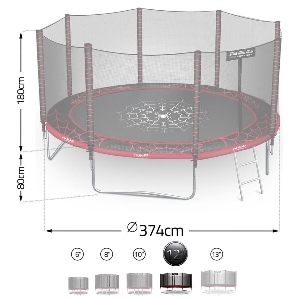 Trampolina NEO SPORT o imponującej średnicy 374 cm zapewnia mnóstwo miejsca do skakania – idealna dla dzieci i dorosłych!