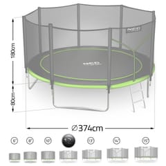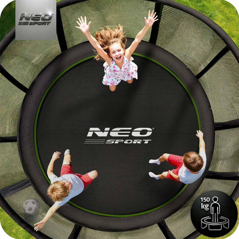 Trampolina NEO SPORT o imponującej średnicy 374 cm zapewnia mnóstwo miejsca do skakania – idealna dla dzieci i dorosłych!