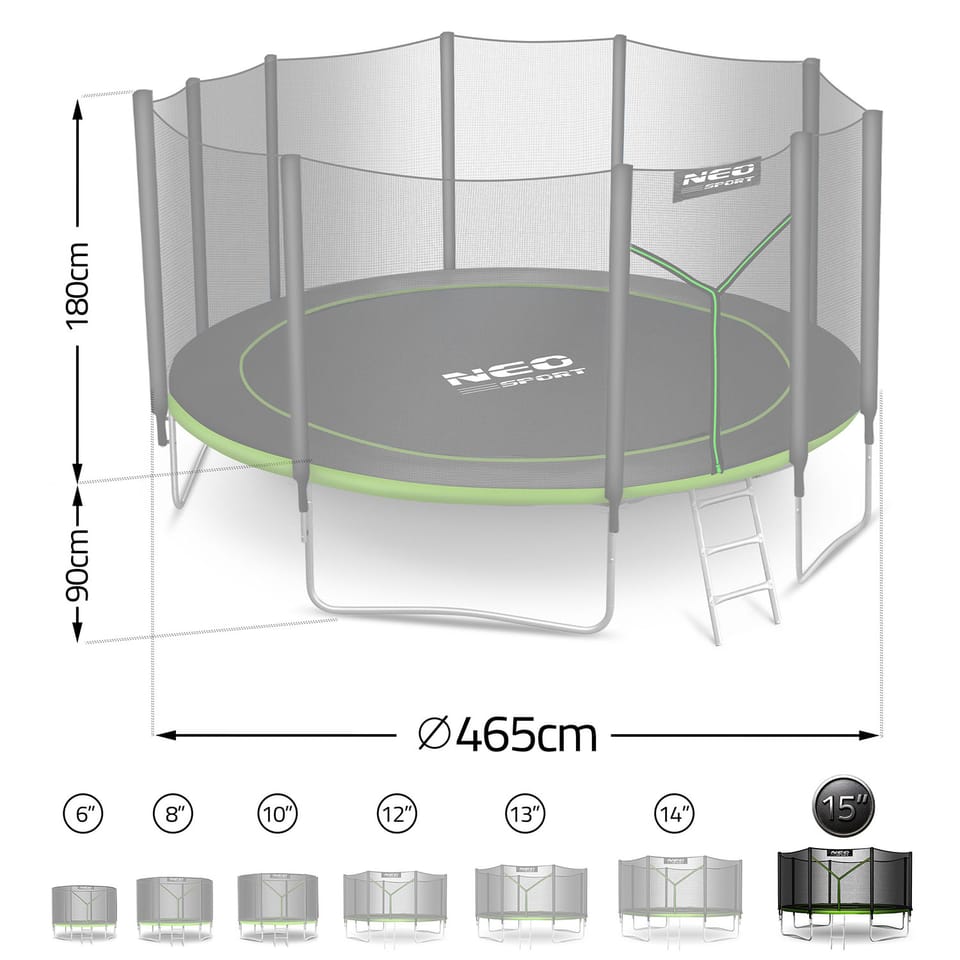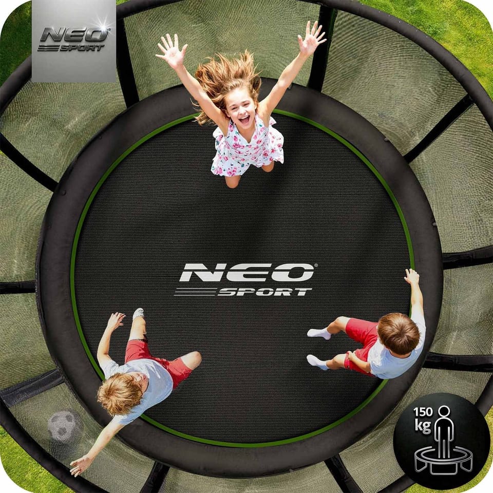 Trampolina NEO SPORT o imponującej średnicy 456 cm zapewnia mnóstwo miejsca do skakania – idealna dla dzieci i dorosłych!
