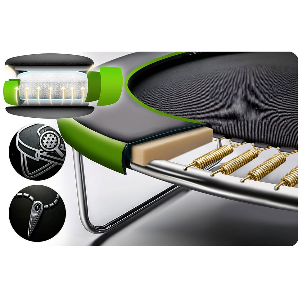 Zastosowaliśmy wydłużone i mocno naprężone sprężyny o zwiększonej elastyczności – dla jeszcze lepszego odbicia i komfortu skakania.
