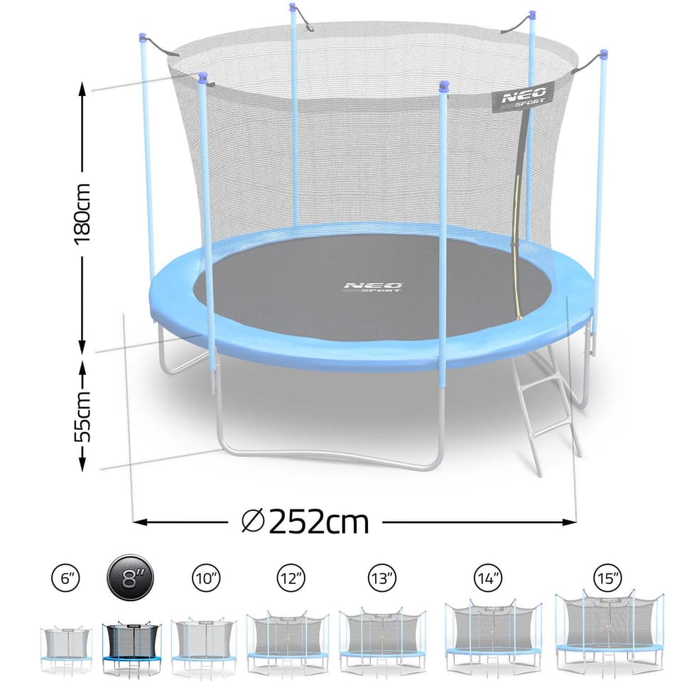 Trampolina NEO SPORT o imponującej średnicy 252 cm zapewnia mnóstwo miejsca do skakania – idealna dla dzieci i dorosłych!