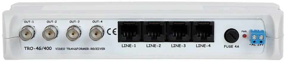 TRO-4G/400 przeznaczony jest do zasilania napięciem stałym oraz odbioru sygnału wizyjnego z 4 urządzeń TRN-1/400 (transformatorów wideo - nadajników), za pomocą skrętki komputerowej (UTP, FTP) na odległość do 400 metrówSygnał z kamery doprowadzony do wejścia nadajnika TRN-1/400, zostaje przesłany do odbiornika TRO-4G/400 za pomocą skrętki komputerowej. W nadajniku i odbiorniku następuje dopasowanie impedancji kabla koncentrycznego 75Ω do impedancji przewodu symetrycznego co zapewnia przesył wizji do 400 metrów.