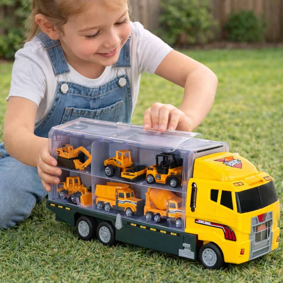 Gotowi do budowy? Ta duża ciężarówka TIR pozwoli Twojemu dziecku bezpiecznie transportować małe auta i maszyny budowlane.