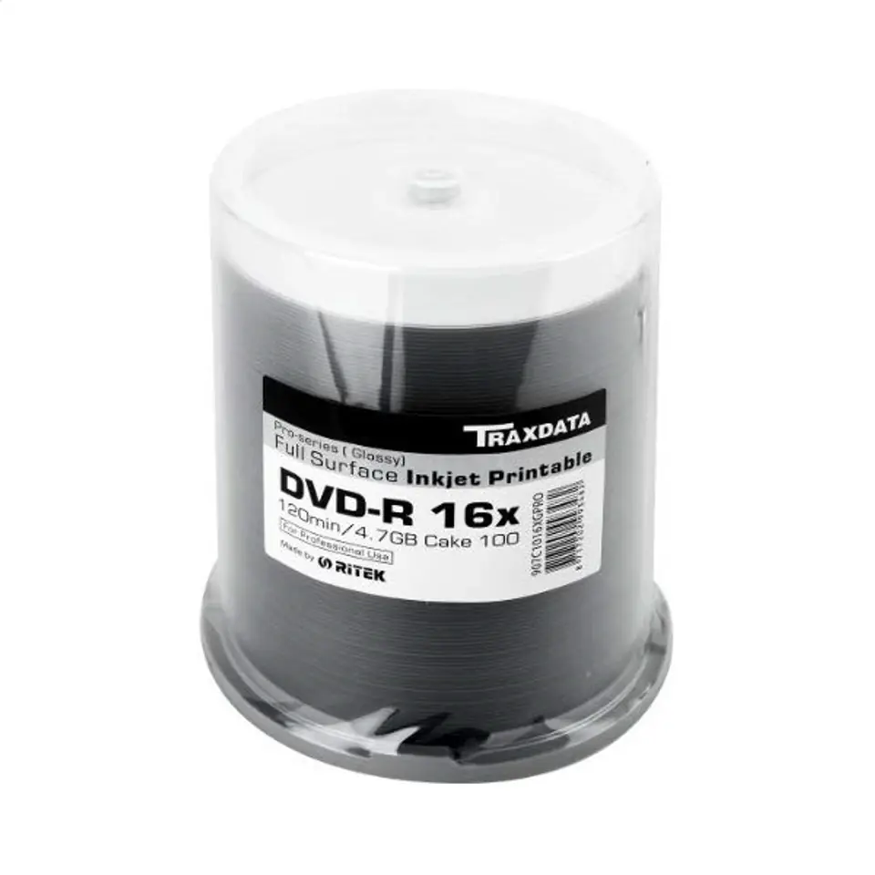 TRAXDATA DVD-R 4,7GB 16X PRO WHITE GLOSSY INK FF PRINT C100 907C1016XGPROHigh quality discs for professional purposes.Full surface white inkjet printable area with glossy surface.Capacity: 4,7GBRecording speed: 1-16XPacked in cake box 100 pcs.Product code: 907C1016XGPRO