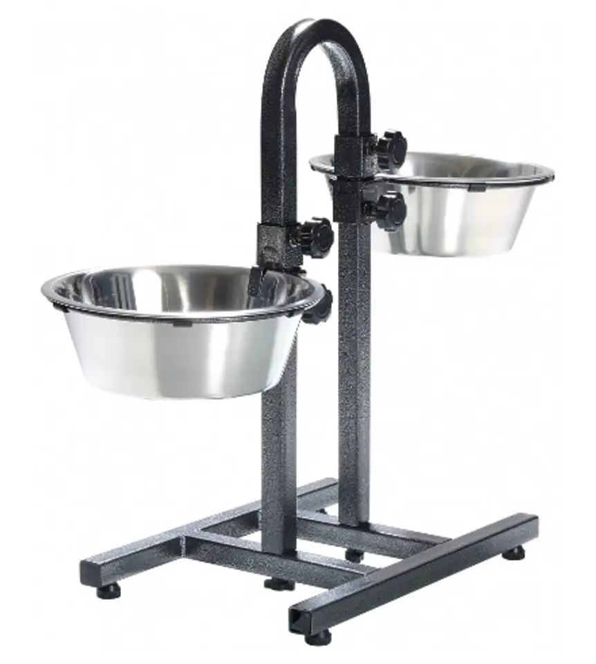 Stojak z dwiema miskami ze stali nierdzewnejMiski można ustawić na różnej wysokości - pełna regulacja do 43 cm.Właściwa postawa psa wspomaga prawidłowe trawienieStojak pozwala starszym lub schorowanym psom na dostęp do karmy bez schylania się.Antypoślizgowe stopki.
