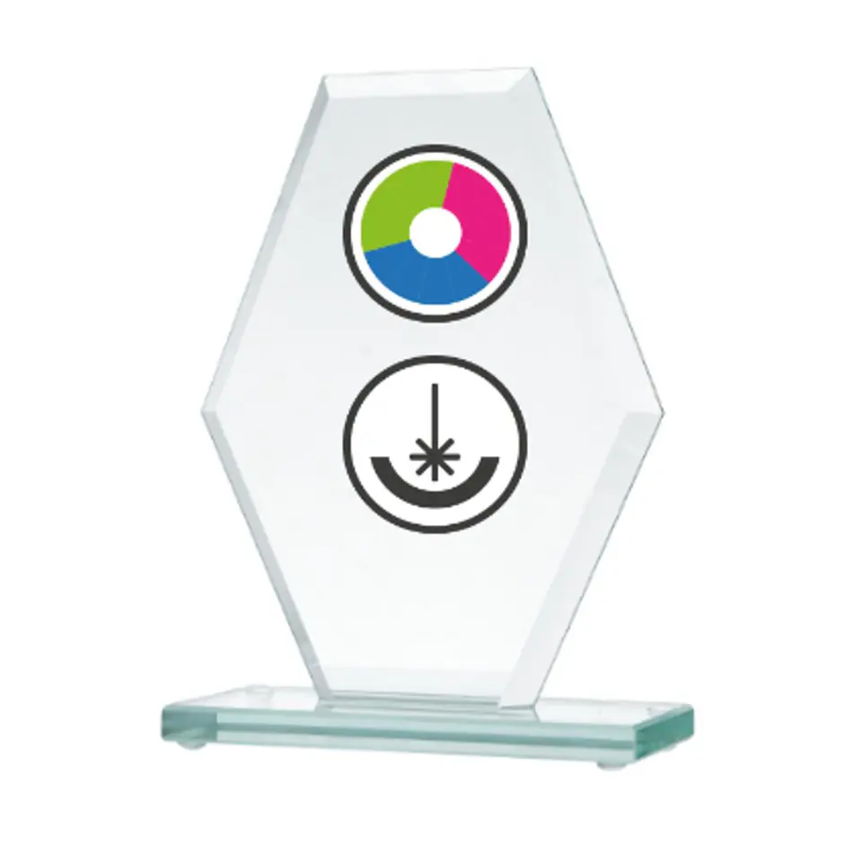 Trofeum szklane z nadrukiem kolorowym LuxorJet, grawerowaniem oraz wypełnieniem farbą