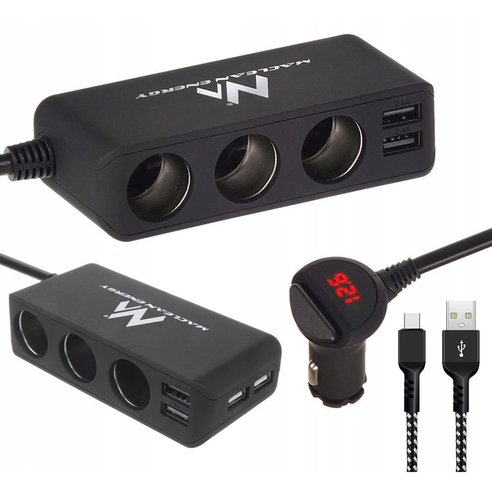 Nowoczesny designBardzo estetyczny wygląd sprawia, iż rozdzielacz bardzo dobrze wkomponuje się w wygląd każdego samochodu.Najwyższa jakośćRozgałęziacz gniazda zapalniczki rozwiązuje problem zapotrzebowania na prąd kilku urządzeń podczas podróży samochodem.W przypadku podłączenia jednego urządzenia poprzez USB, maksymalny pobór energii wynosi 5V, 2.4A.Zintegrowany woltomierz we wtyczce rozdzielacza umożliwia kontrolę napięcia!Pobór energii z 3 gniazd ładowarek zapalniczki wynosi 12V-24V, 7A (max), Moc: 120W (max).