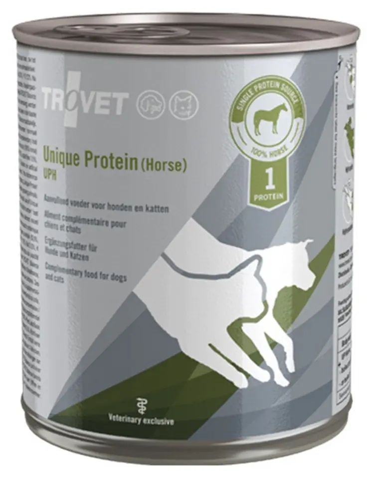 Unique Protein UPH (z koniną)Mokra karma uzupełniająca dla psów i kotówKarma Trovet Unique Protein zawiera dodatek oleju z oliwek i oleju słonecznikowego.Karma wykorzystywana do samodzielnego gotowania w połączeniu z ryżem czy ziemniakami.Wskazania: