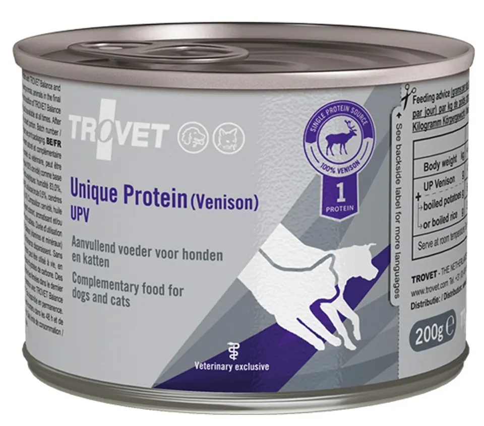 Unique Protein UPV (z dziczyzną)Idealna mokra karma uzupełniająca dla kotów i psów. Karma jest z dodatkiem mięsa z dziczyzny.Karma Trovet Unique Protein UPV (z dziczyzną) zawiera dodatek oleju z oliwek i oleju słonecznikowego.Karma wykorzystywana do samodzielnego gotowania w połączeniu z ryżem czy ziemniakami.Wskazania: