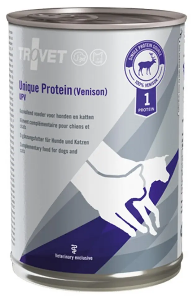 Unique Protein UPV (z dziczyzną)Idealna mokra karma uzupełniająca dla kotów i psów. Karma jest z dodatkiem mięsa z dziczyzny.Karma Trovet Unique Protein UPV (z dziczyzną) zawiera dodatek oleju z oliwek i oleju słonecznikowego.Karma wykorzystywana do samodzielnego gotowania w połączeniu z ryżem czy ziemniakami.Wskazania: