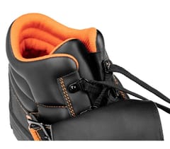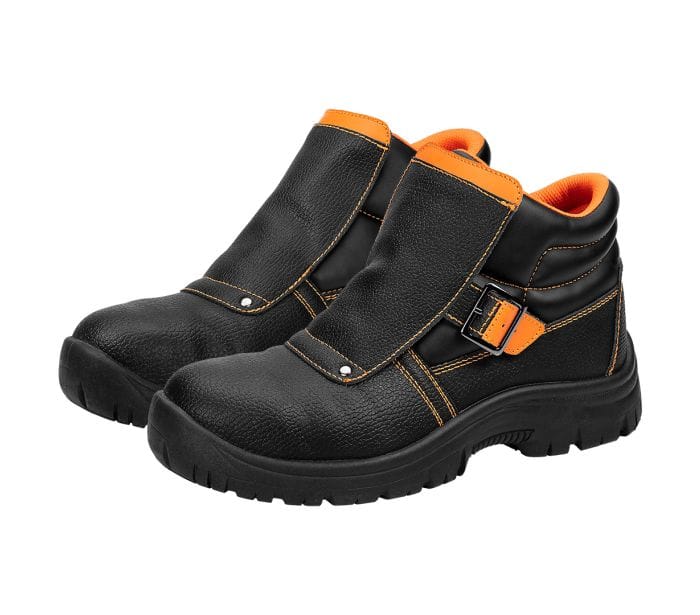 Trzewiki spawalnicze S1P SRC, cholewka: skórzana z wytłaczanej dwoiny, wyściółka: dzianina siatka, podeszwa: PU/PU, wkładka: pianka EVA, metalowy podnosek i metalowa wkładka antyprzebiciowa, but wykonany w kategorii S1P SRC (SRC- odporność na poślizg na podłożu ceramicznym pokrytym roztworem laurylosiarczanu sodu (SLS) i na podłożu ze stali pokrytym glicerolem), podnosek zapewniający ochronę przed uderzeniami z energią równą 200J, odporność na przebicie, zabudowana pięta, odporność na oleje, benzynę i inne rozpuszczalniki organiczne, właściwości antyelektrostatyczne, absorbcja energii w części piętowej, pojedyncze i podwójne szwy, osłona sznurowadeł zapinane na pasek z klamrą, trzewiki dedykowany do prac spawalniczych i przy obróbce metali, Certyfikat CE, rozmiar 44