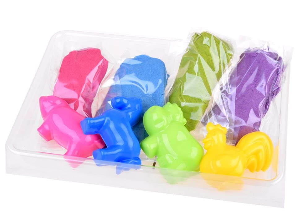 PIASEK DYNAMICZNY - ZESTAW FARMA to kolejna propozycja znanej i lubianej marki Tuban. Piasek dynamiczny (nazywany też kinetycznym) to piasek o specjalnych właściwościach, dzięki którym jest on w ciągłym "ruchu". Jego konsystencja powoduje, że po umieszczeniu go w dłoni swobodnie przelewa się przez palce. Kolorowy piasek dynamiczny można użyć w każdej chwili, nadaje się do zabawy w domu, przedszkolu i szkole. Piasek przesypuje się ale nie rozsypuje - dzięki czemu można go formować i jest łatwy do zebrania po zakończonej zabawie. Jest wielokrotnego użytku - nie twardnieje i nie wysycha, zachowuje przez długi czas swoje właściwości. Co najważniejsze nie brudzi rączek i jest 100% bezpieczny. Każde dziecko lubi zabawę w piaskownicy, a magiczna zabawa piaskiem dostarczy wiele frajdy i radości. 4 kolory piasku: różowy, fioletowy, zielony, niebieski; oraz 4 foremki w kształcie: koguta, hipopotama, konia i świnki - pozwolą na stworzenie mnóstwa kolorowych piaskowych rzeźb. Z takim zestawem na pewno nie zabraknie pomysłów na zabawę.