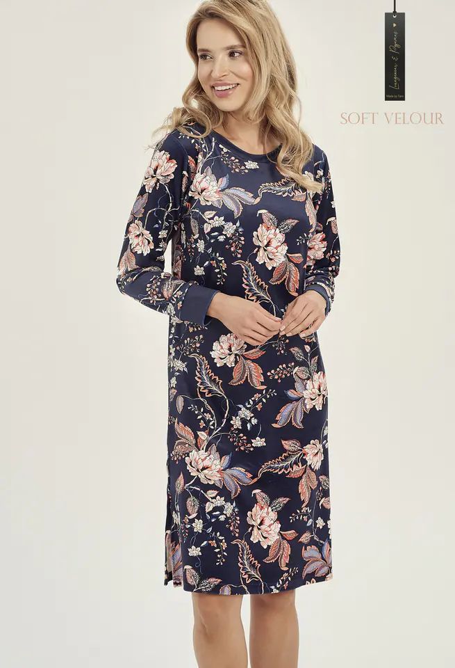 Wzorzysta koszula damska z długim rękawem. Rękawy zakończone wygodnym ściągaczem, długość za kolano. Skład: 94% poliester, 6% elastan.