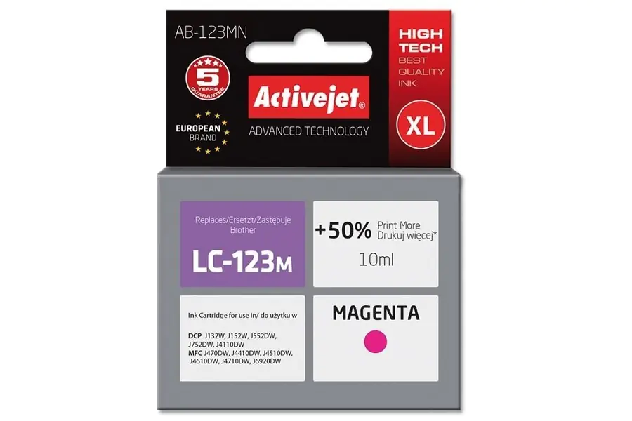 Kartridże ActiveJet skierowane są do klientów oczekujących wydruku w najwyższej jakości. Charakteryzują się zwiększoną pojemnością w stosunku do produktów oryginalnych, oraz wiernym odwzorowaniem rodzaju atramentu. Wszystkie kartridże poddawane są licznym testom zastosowanym na każdym etapie produkcji, co skutecznie eliminuje wystąpienie usterek oraz daje satysfakcję najlepszego druku. Tusz magenta (barwnik) atramentowy do drukarki Brother, zamiennik, pojemność 10 ml, wersja supreme. Pasuje do drukarek: DCP: J132W, J152W, J552DW, J752DW, J4110DW, ; MFC: J470DW, J4410DW, J4510DW, J4610DW, J4710DW, J6920DW