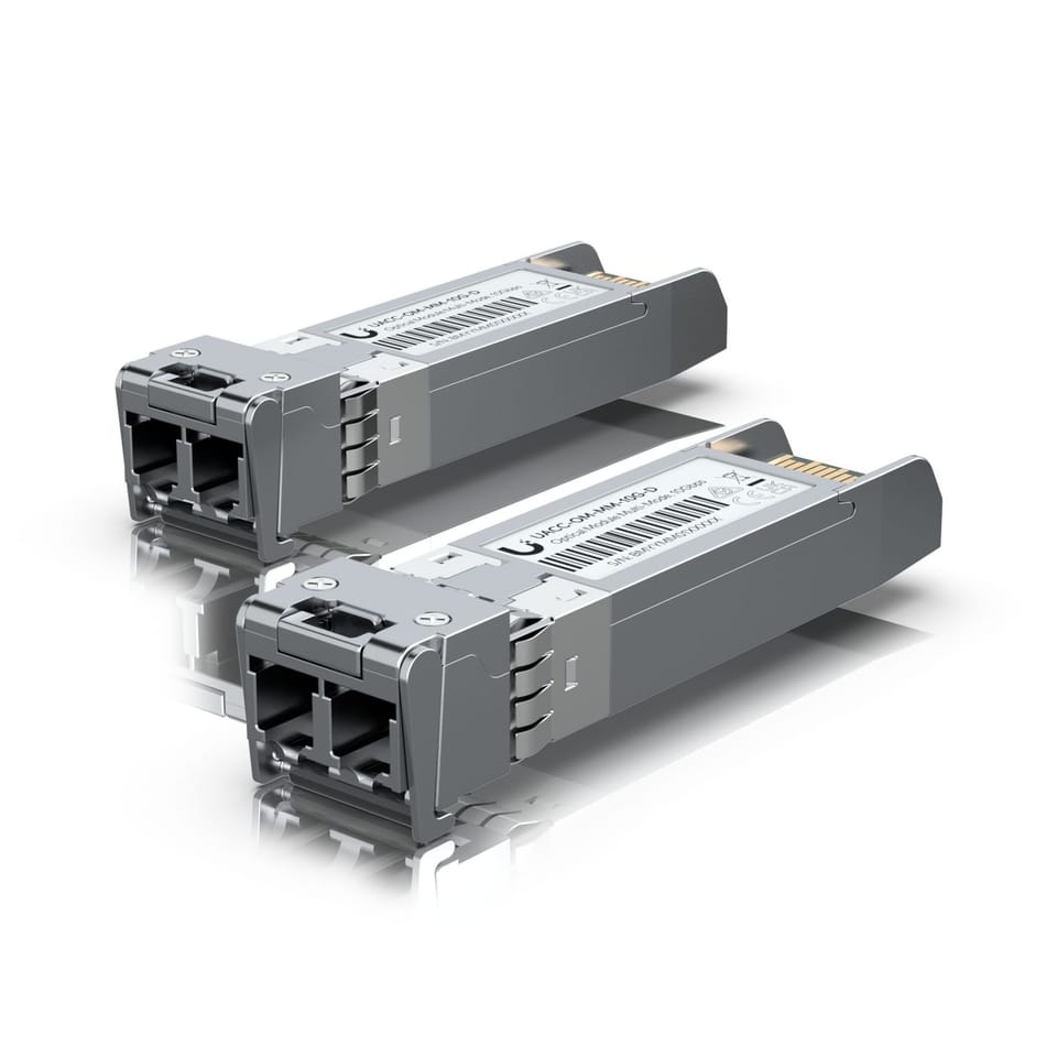 Ubiquiti SFP+ transceiver that supports 10G connections up to 300 m using multi-mode fiber with a duplex LC UPC connector.