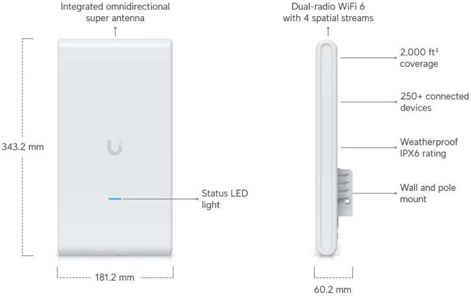 Ubiquiti Indoor/outdoor WiFi 6 AP with 4 spatial streams, an integrated super antenna, and a gigabit passthrough port.