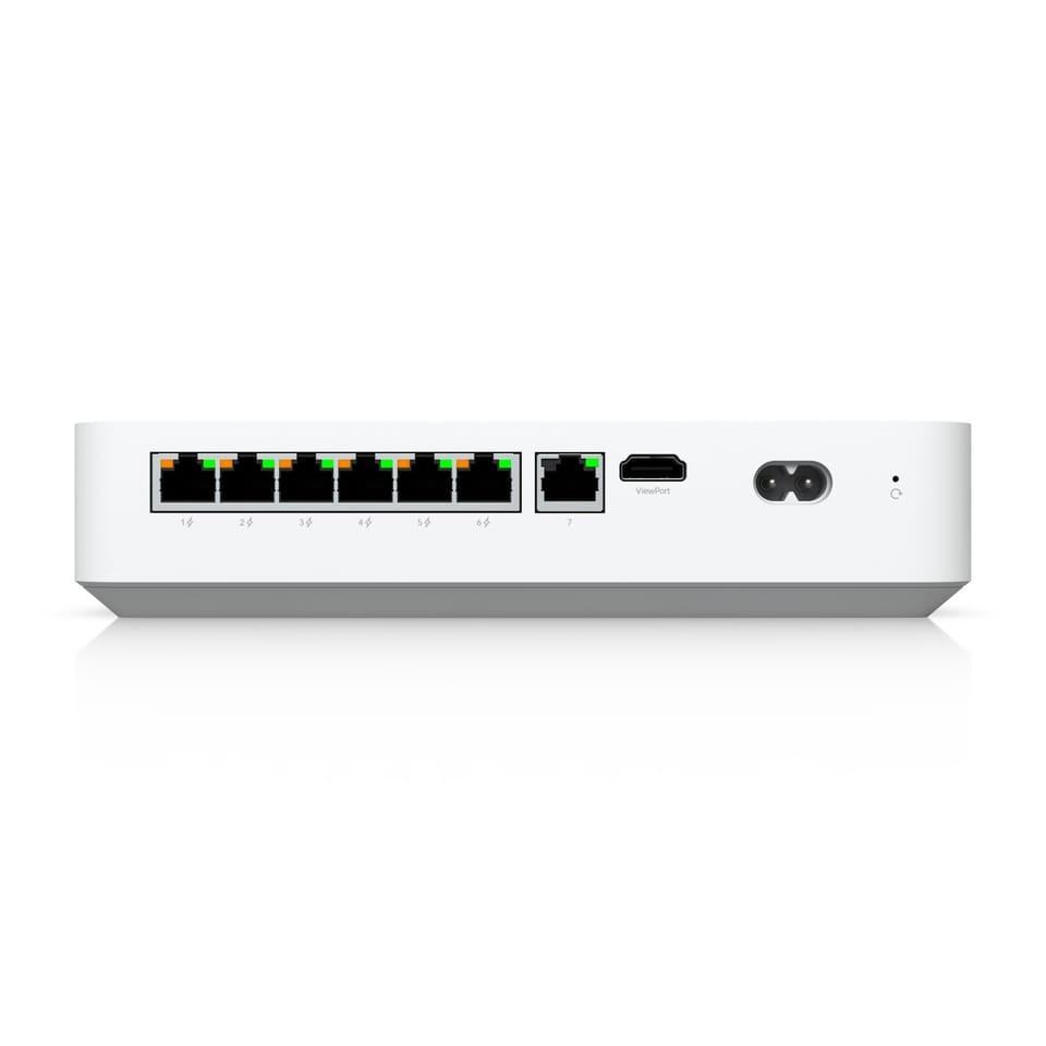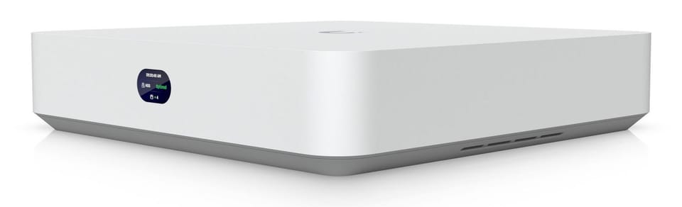 Ubiquiti Compact UniFi Protect NVR with 3.5" HDD support, featuring an integrated 6-port PoE switch, integrated HDMI View Port, and a