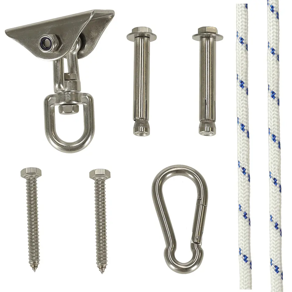 Zestaw składa się z takich części jak: obrotowy hak sufitowy, karabińczyk, lina i cztery śruby – czyli wszystko, czego będziesz potrzebować!