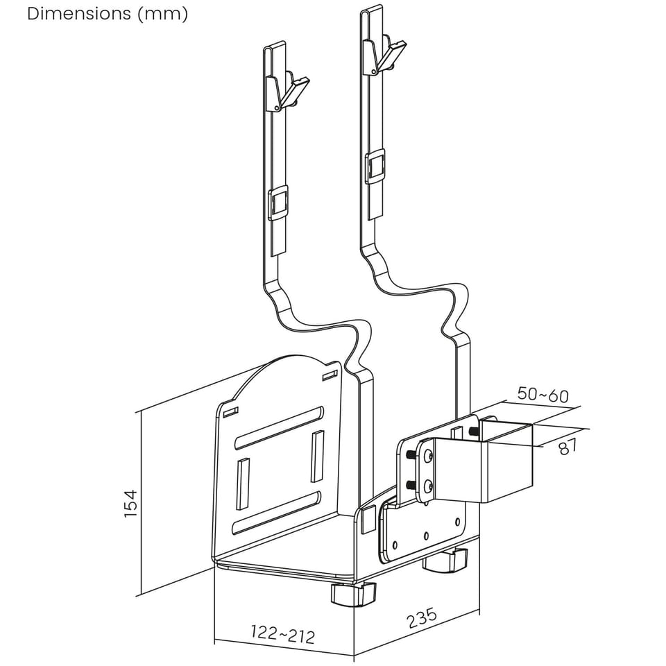 Uchwyt oferuje regulację głębokości w zakresie 122–212 mm, dzięki czemu bez problemu dopasujesz go do różnych modeli obudów typu tower. Solidna stalowa konstrukcja zapewnia nośność do 10 kg, a dwa regulowane pasy z klamrami zatrzaskowymi stabilizują komputer w uchwycie, zapobiegając jego przechylaniu się i przemieszczaniu – nawet podczas wibracji lub przypadkowych uderzeń.