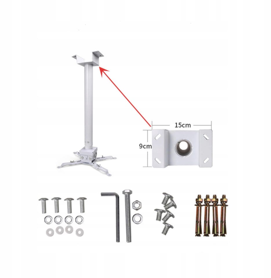 - W komplecie akcesoria montażowe: wszystkie narzędzia do montażu, wiele rodzajów śrub pasujących do wszystkich projektorów, kołki rozporowe. Jedyne co musisz zrobić we własnym zakresie to wywiercić otwory w ścianie lub suficie pod uchwyt.