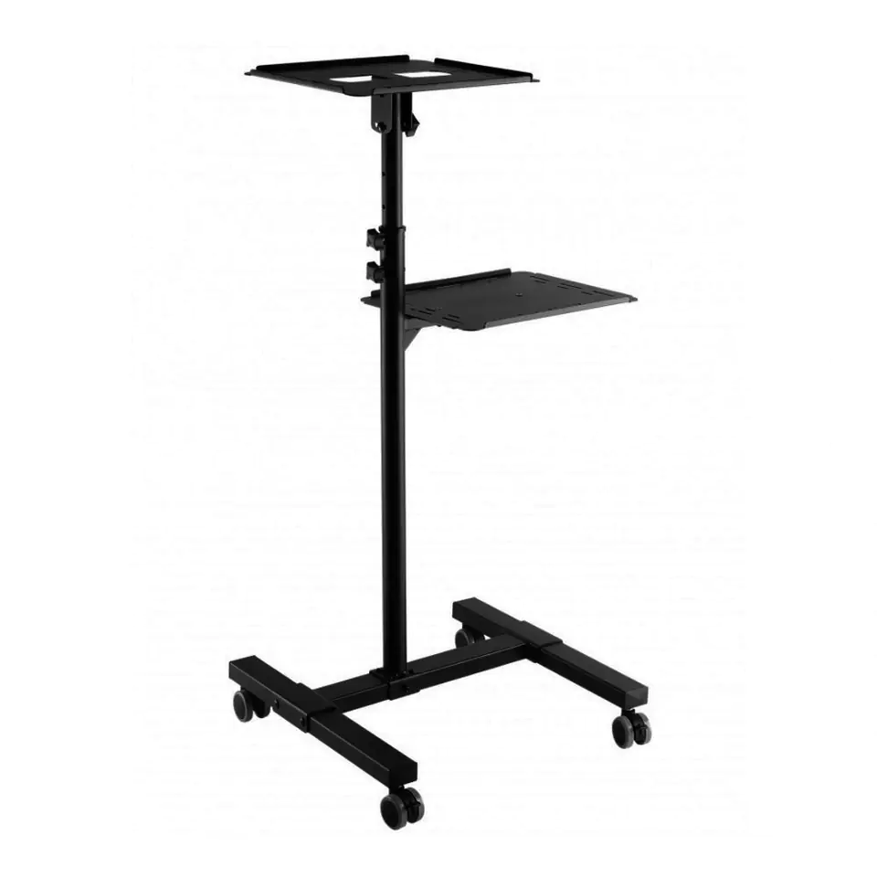 Ten wózek z regulacją wysokości to bardzo wszechstronna jednostka o dużej powierzchni do przechowywania projektora, laptopa, myszy, książek i innych rzeczy. Górną półkę można przechylić o 12° w górę i 12° w dół, aby zoptymalizować najlepszy kąt, a podniesiona krawędź zapobiega przesuwaniu się urządzenia. Ruchoma konstrukcja z czterema kółkami zapewnia większą stabilność.