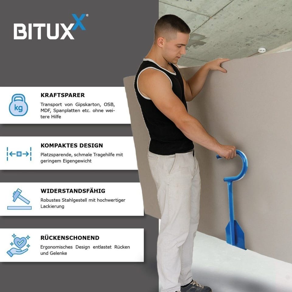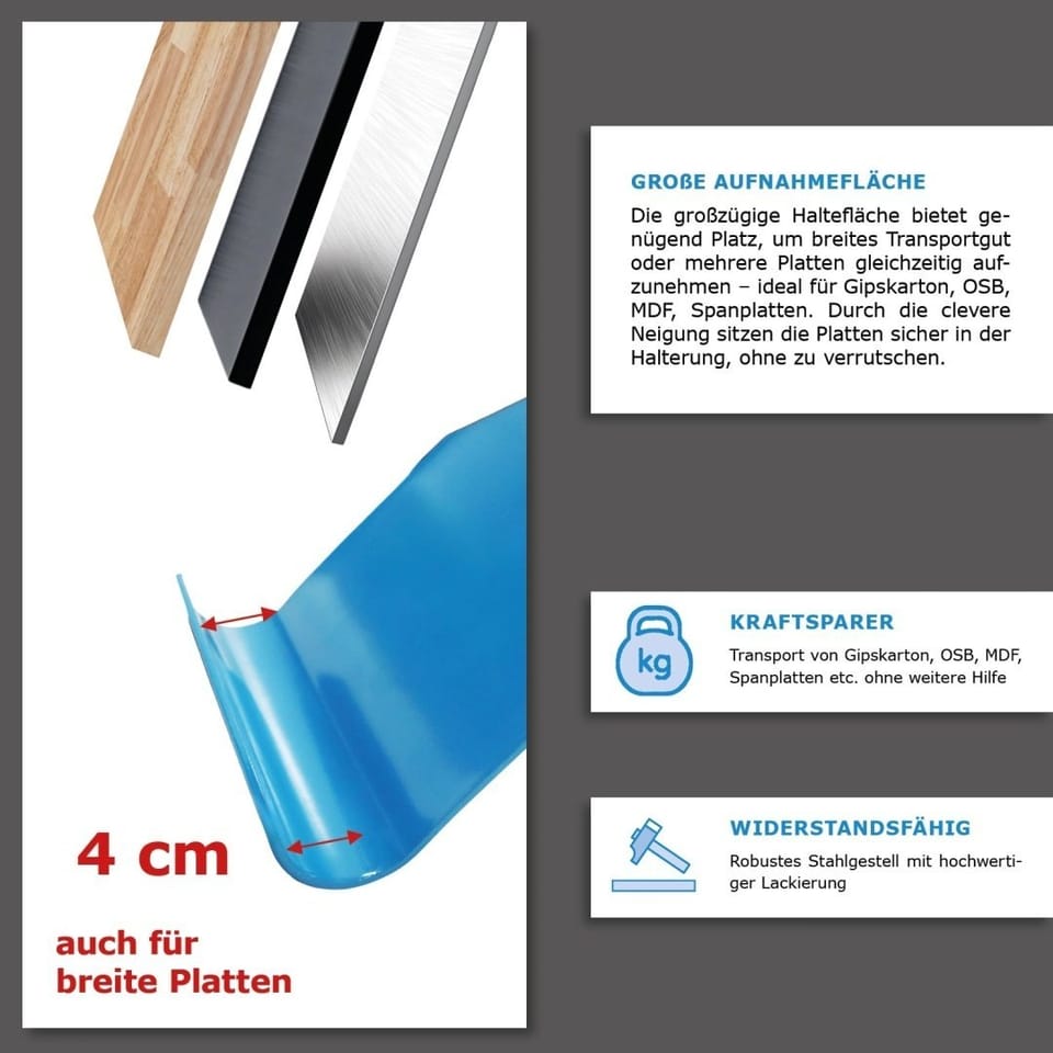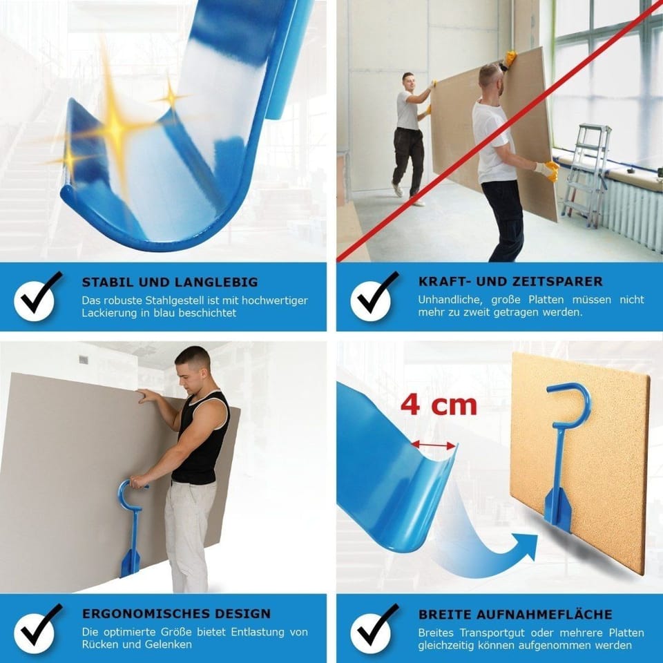 Profesjonalny uchwyt do bezpiecznego i wygodnego przenoszenia ciężkich oraz dużych płyt. Idealne rozwiązanie zarówno dla budowlańców, jak i majsterkowiczów. Umożliwia transport płyt przez jedną osobę, bez nadmiernego obciążania pleców i rąk.