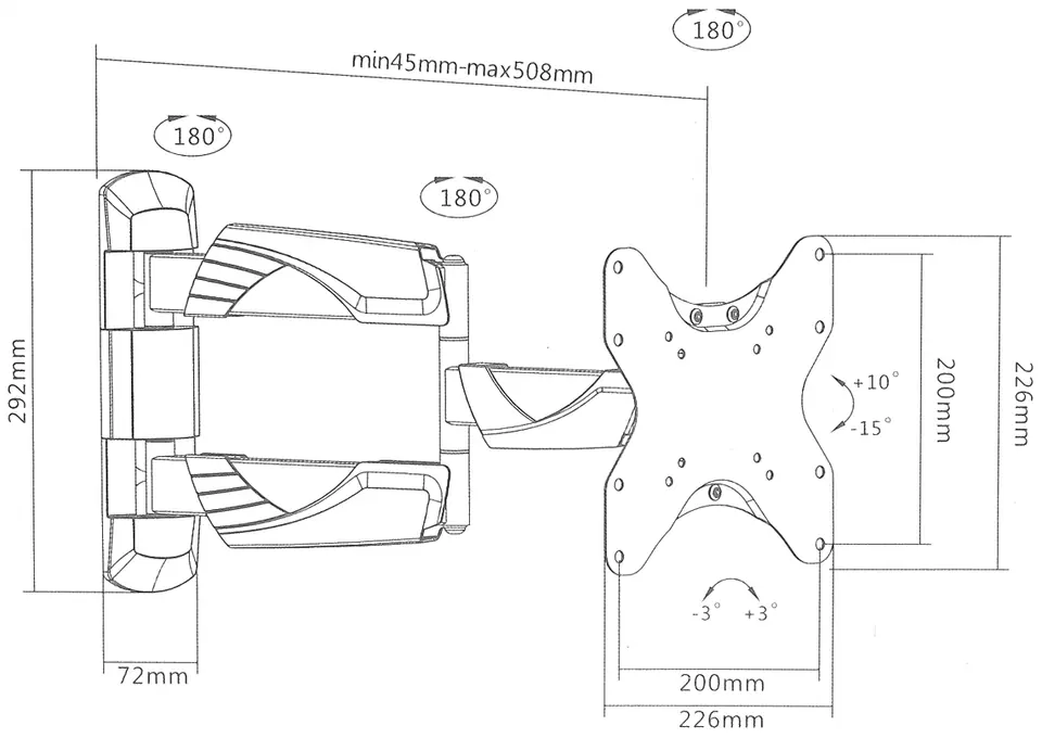 Posiada łatwą regulację pochylenia panelu w pionie w granicach ±15° oraz obrotu w poziomie na 3 przegubach o 180° każdyMożliwa jest rotacja w płaszczyźnie ekranu o ±3°