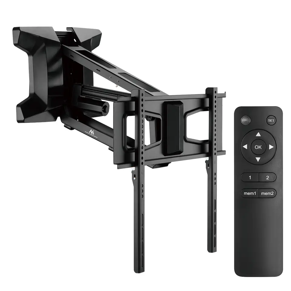 Wysokiej jakości elektryczny uchwyt ścienny z dołączonym pilotem zdalnego sterowania, pozwala na szybką i wygodną regulację wysokości telewizora bez ruszania się z miejsca.