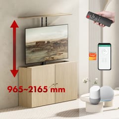 Cechy- Uchwyt pozwala na eleganckie ukrycie telewizora w szafce, wysuwając go tylko wtedy, gdy jest potrzebny- Umożliwia zarówno wysuwanie telewizora z szafek podłogowych, jak i opuszczanie z szafek wiszących- Przeznaczony do telewizorów o przekątnej od 43 do 88 cali- Maksymalne obciążenie: aż 60 kg- Zakres regulacji wysokości od 965 do 2165 mm pozwala na dopasowanie do potrzeb użytkownika- System unikania kolizji automatycznie zatrzymuje ruch w przypadku napotkania przeszkody- Pilot zdalnego sterowania zapewnia wygodną obsługę i możliwość zapamiętania dwóch ulubionych pozycji telewizora- Darmowa aplikacja Tuya umożliwia sterowanie z poziomu smartfona lub tabletu- Kompatybilność z Amazon Alexa i Google Home pozwala na obsługę głosową- Solidna konstrukcja stalowa malowana proszkowo gwarantuje trwałość oraz odporność na zarysowania i korozję- W zestawie znajduje się kompletny pakiet śrub i akcesoriów montażowych oraz instrukcja krok po kroku- VESA: 200x200, 200x300, 300x200, 200x400, 400x200, 300x300, 300x400, 400x300, 600x200, 350x350, 500x300, 400x400, 600x300, 500x400, 600x400 mm- Kolor: czarny