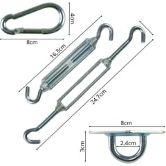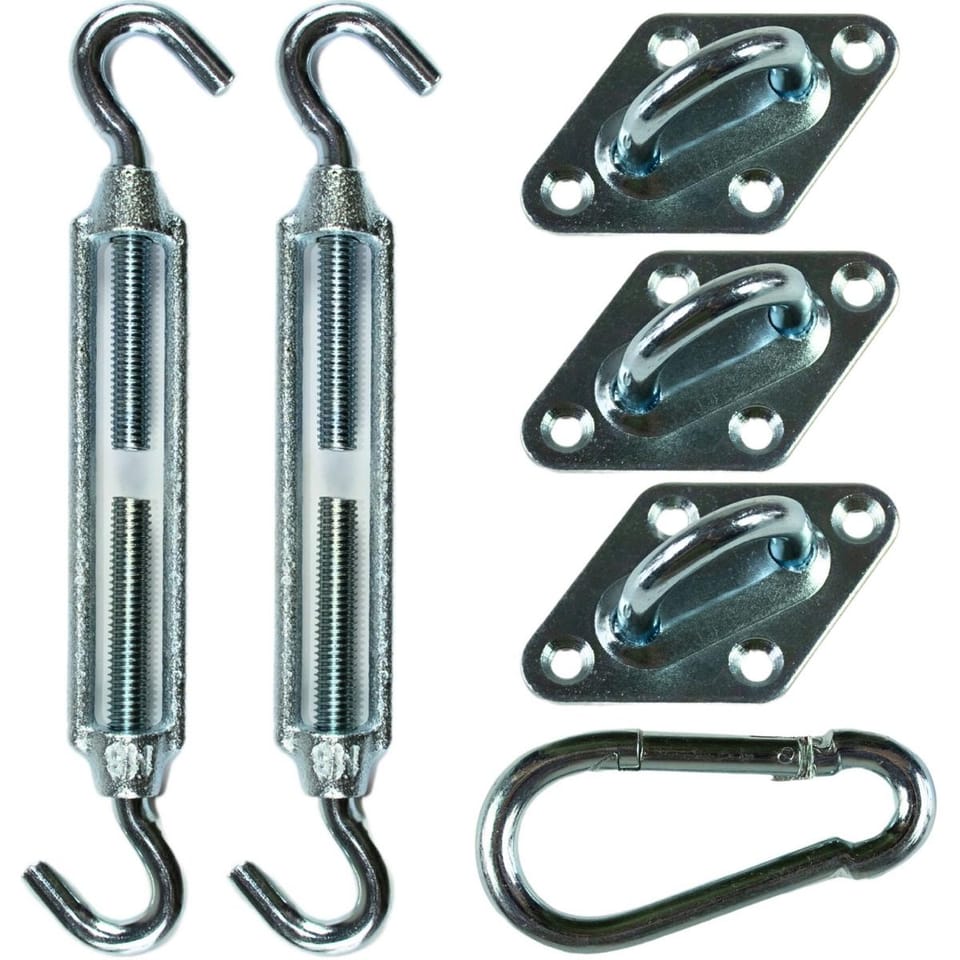 - w skład zestawu wchodzą 3 uchwyty pokładowe, 1 karabińczyk, 2 śruby rzymskiepasuje do większości dostępnych na rynku tkanin, siatek i żagli przeciwsłonecznychwystarczy kilka podstawowych narzędzi, by zamocować zestaw nawet w pojedynkędyskretny, srebrny kolor pasuje do każdej aranżacji ogrodu czy tarasuelementy wykonane z dobrej jakości materiałów