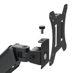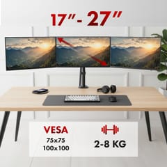 Specyfikacja- Producent: Maclean- Model: MC-137- Kolor: czarny- Materiał wykonania: stal malowana proszkowo, tworzywo sztuczne- Przeznaczony dla monitorów o przekątnej: od 17 do 27 cali- Maksymalne obciążenie: 8 kg- Standard mocowania VESA: 75x75, 100x100- Zakres regulacji nachylenia ekranów: od -45 do +45°- Zakres obrotu ekranów: od -90 do +90°- Zakres obrotu ramion w przegubach: 180°- Zakres obrotu przy słupku: 180°- Długość ramion: 180 mm + 200-271 mm (w zależności od pozycji)- Wysokość słupka: 405 mm- Minimalna/maksymalna wysokość ekranów na ramionach: 80-570 mm- Mechanizm regulacji: sprężyna gazowa- Montaż: do blatu biurka lub w otworze na przewody- Pasuje do blatów o szerokości: od 10 do 50 mm- Rozmiar dołączonych śrub do monitora: M4x12, M5x12